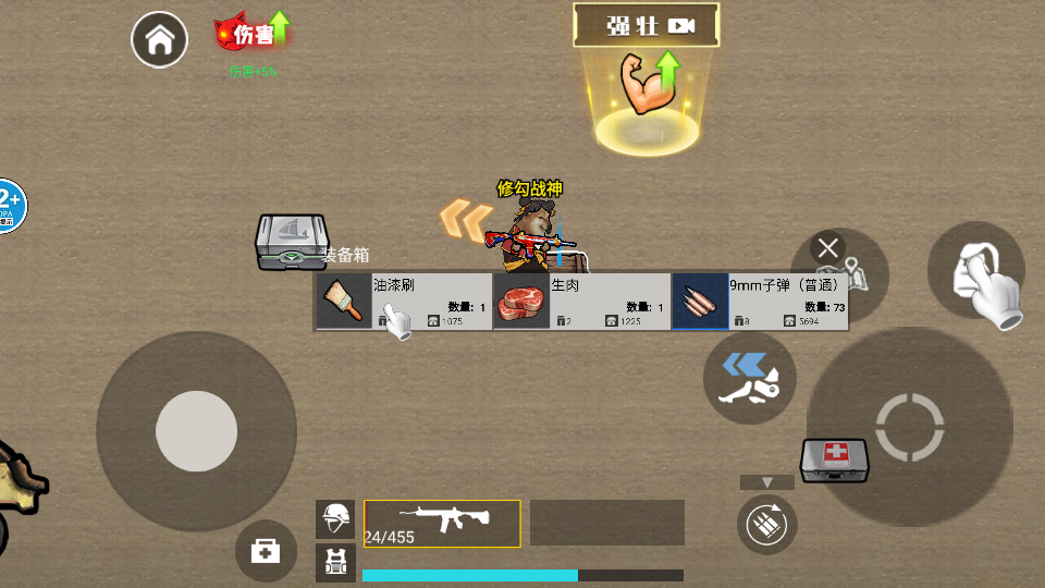 4、打开【装备箱】,可获取【油漆刷】【生肉】【9mm子弹】等物品,还能获取【强壮】buff增强角色。