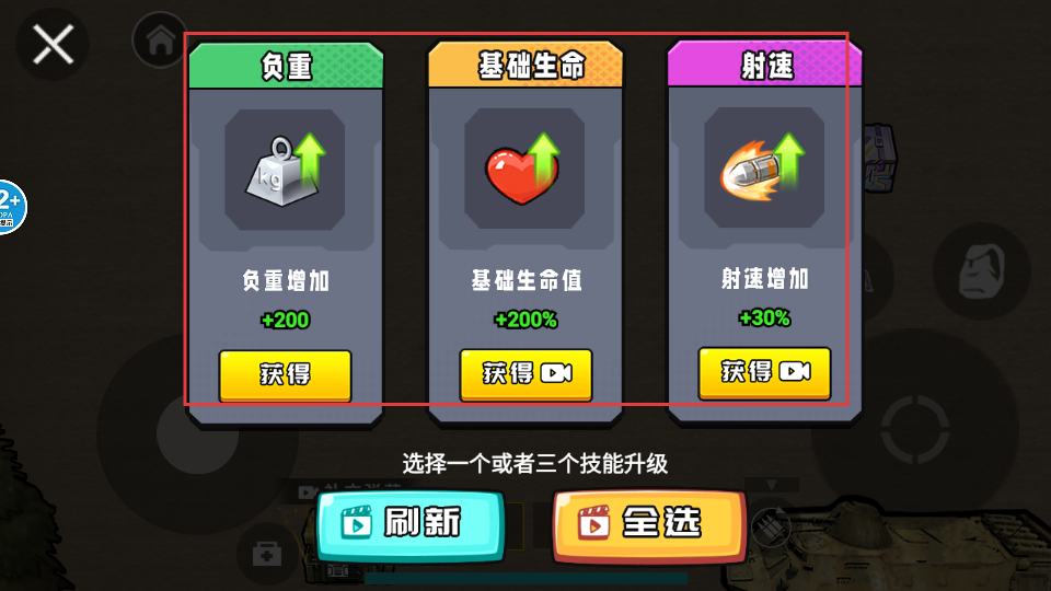 2、在技能升级界面,可选择【负重增加】【生命增加】【射速增加】技能,点击“获得”提升对应属性。