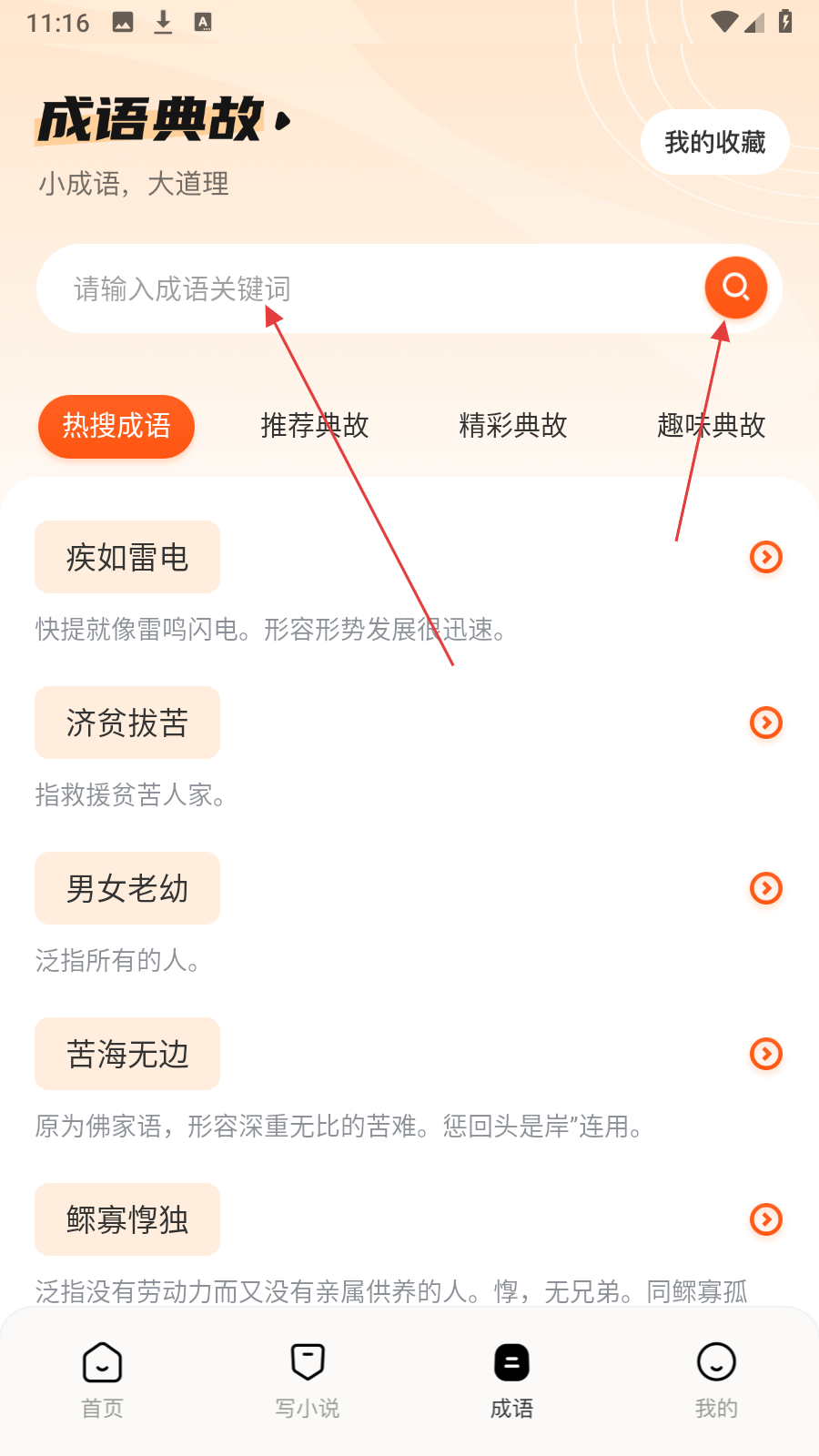 2、在成语典故页面搜索框输入【成语关键词】,点击【搜索】按钮。