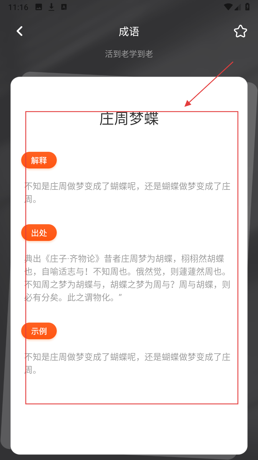 4、进入成语详情页,可查看成语的【解释、出处和示例】。
