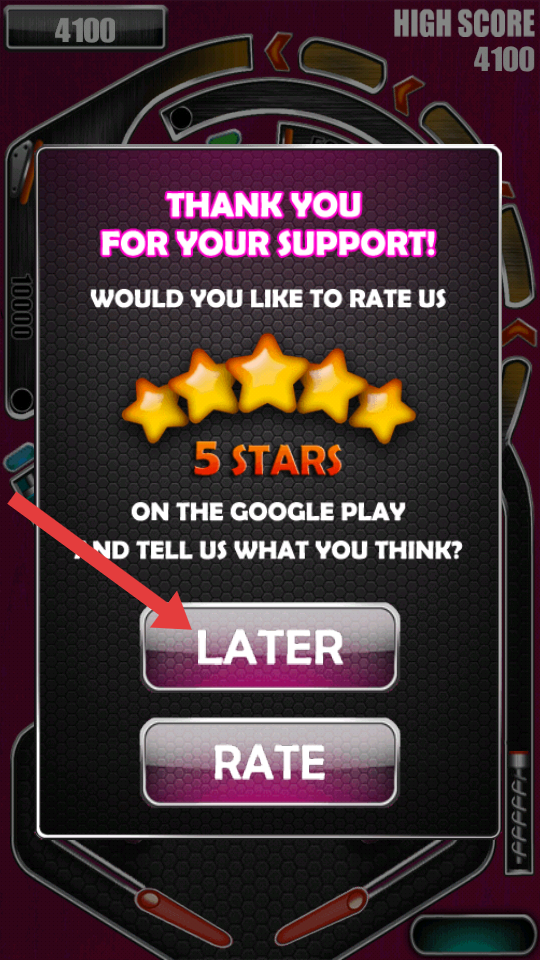 4、游戏结束后,弹出评价窗口,若不想立即评价,点击【LATER】按钮结束游戏。