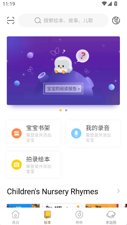 2、绘本功能涵盖宝宝书架、拍录绘本与录音等模块,能够记录阅读过程,保留声音与画面。