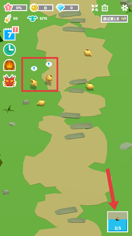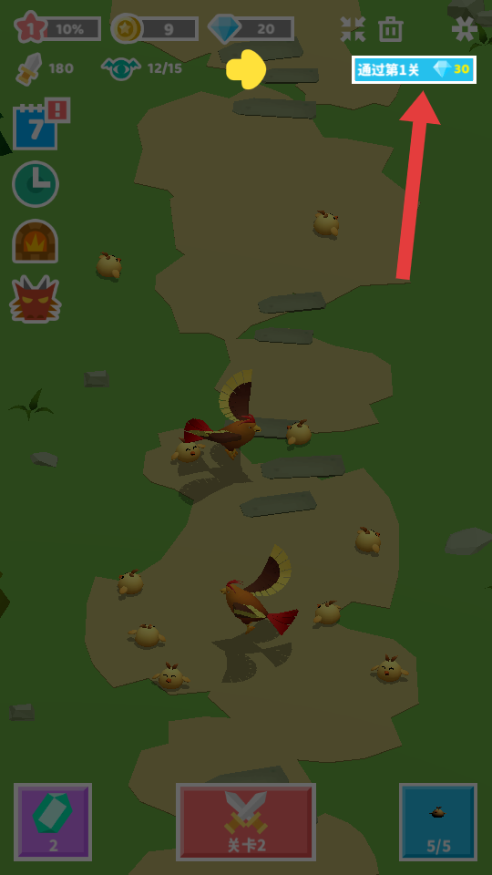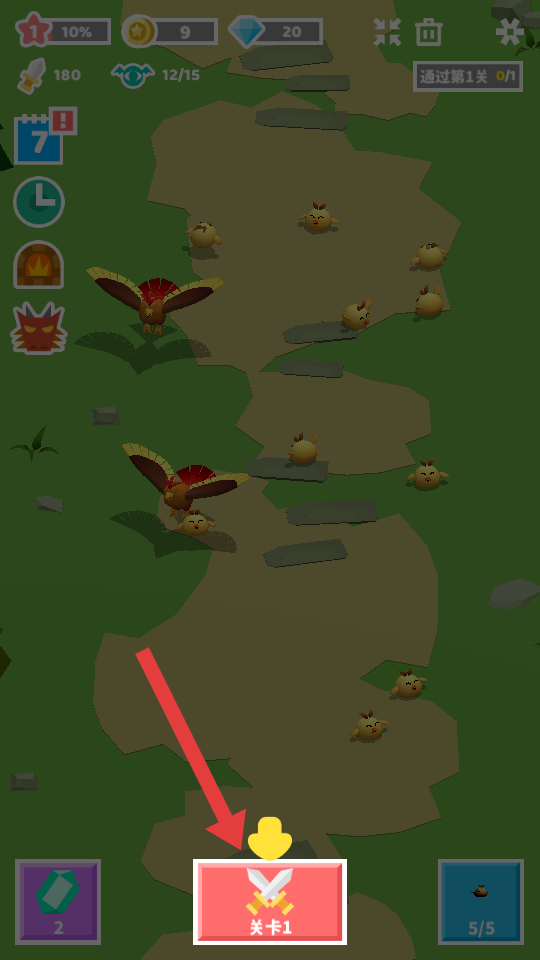 2、玩家合成完小鸡后,点击【关卡1】按钮,进入关卡开启挑战之旅。