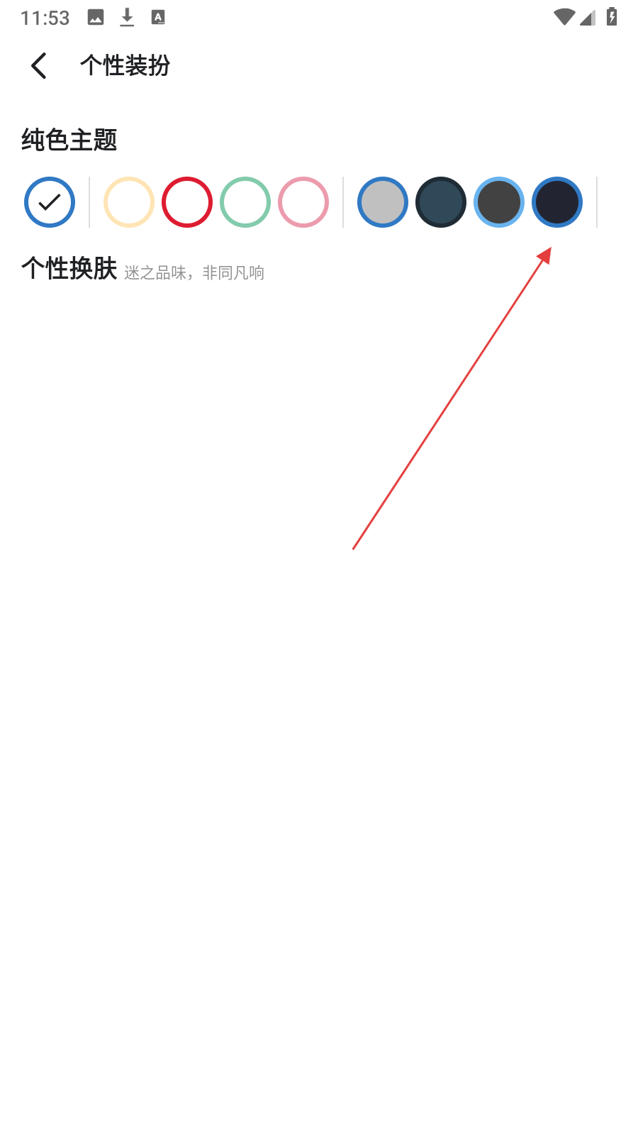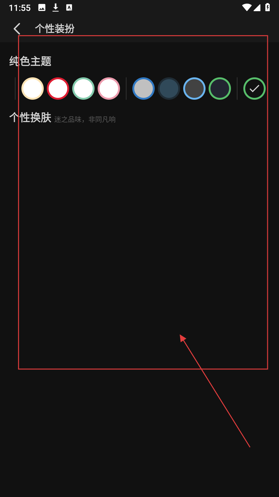 3、在主题设置页面,选择【深色系的纯色主题】,更换软件主题风格。