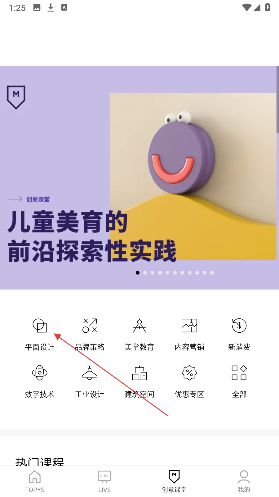 2、在创意课堂页面,点击【平面设计】,进入平面设计课程列表页面。