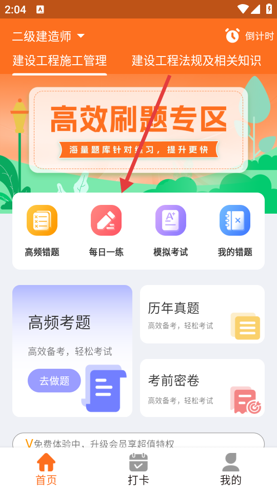 2、进入【首页】,可利用高效刷题专区的高频错题、每日一练等功能学习。