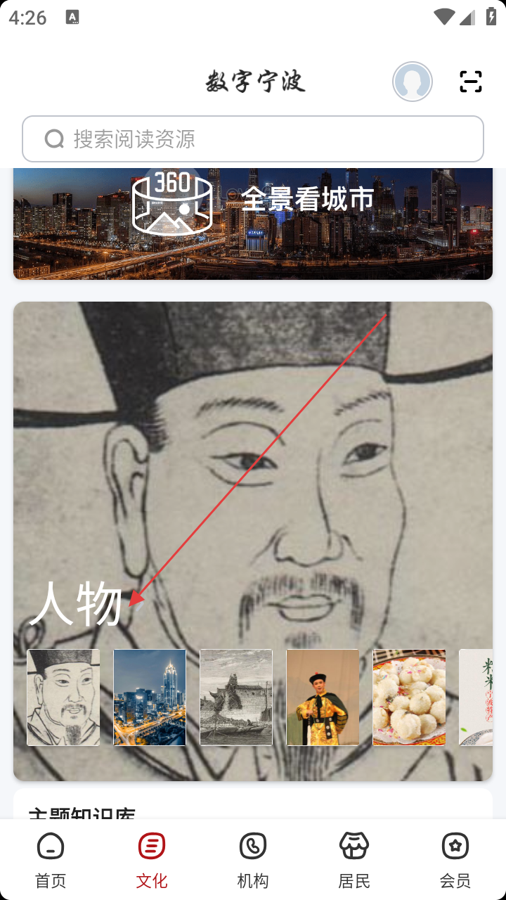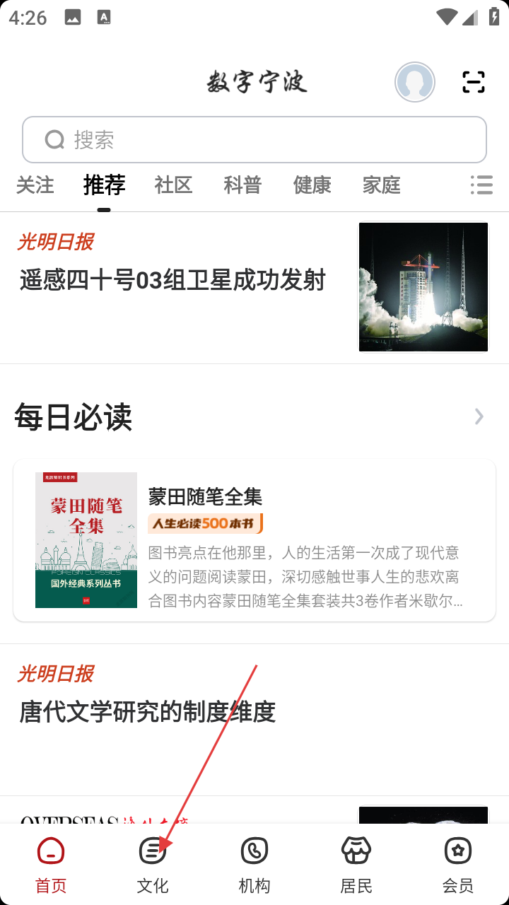 1、打开“数字宁波”APP,在首页点击底部【文化】选项。