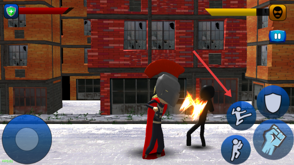 3、进入游戏后,操控角色在场景中移动,利用右侧的攻击、防御等按钮,与黑色火柴人等敌人战斗。