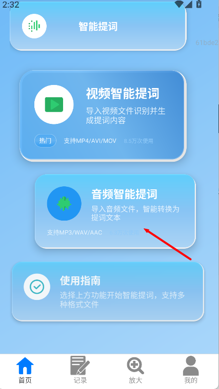 1、进入首页后,点击音频智能提词功能,即可快速进入文字同步显示界面。