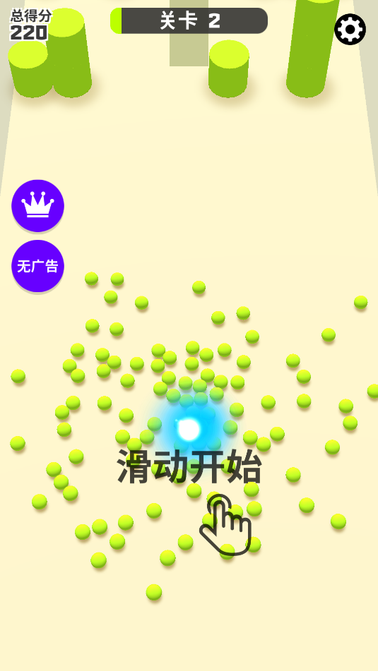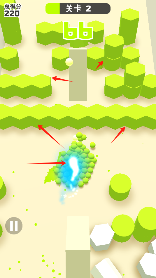 2、发光的白色小球会给旁边的绿色众多小球指引,白色小球移动到哪里,绿色小球便会跟着到哪里,并且会撞击绿色物体获得分数。