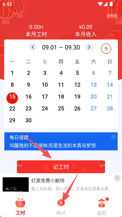3、在记录工时的核心功能外,界面设计贴合场景,红色主题搭配节日元素,既实用又有一定的视觉愉悦感,风格简洁大方。