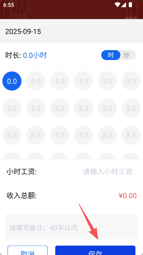 2、设置工时时长、输入小时工资,也可填写备注,然后点击保存。