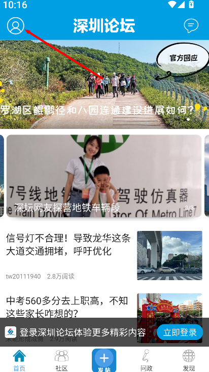 1、进入《深圳论坛》后,在首页点击左上角头像图标,进入个人中心页面。