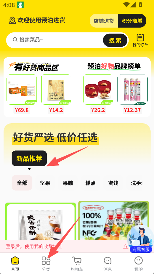 《预泊进货》专注于商品进货服务,首页有“有好货商品区”“好货严选 低价任选”,可按坚果、果脯等类别筛选商品。进入分类页面,能在食品、用品专区下,进一步选择休闲食品等细分品类。找到心仪商品,可查看详情,了解价格、销量,还能加入购物车,方便进货采购。