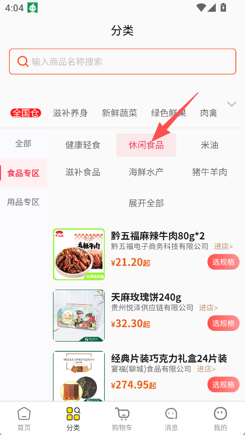 2、在分类页食品专区下,选择“休闲食品”类,浏览商品。