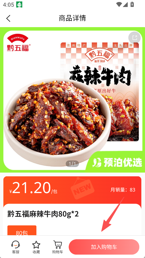 3、点击目标商品,查看价格、销量等信息后,点击“加入购物车”,完成进货准备。
