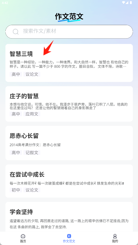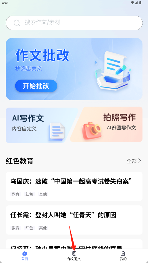 1、在首页点击底部“作文范文”选项、进入海量范文库题材。