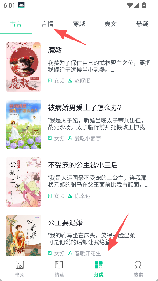 1、小说分类覆盖全面,涵盖古言、言情、穿越等多种类型,点击对应分类即可浏览相关小说,方便快速定位喜好内容。