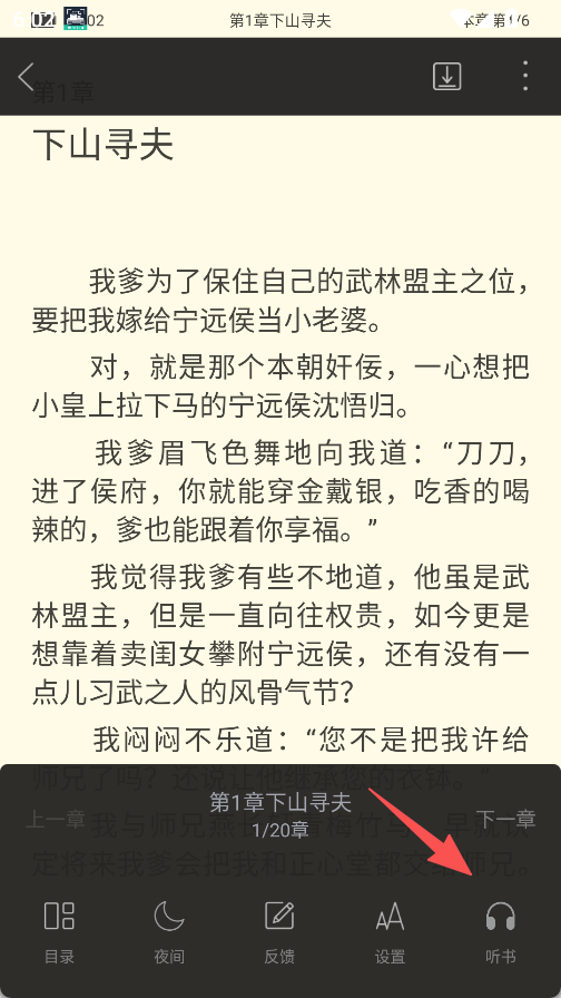 2、具备阅读辅助功能,阅读页面内可调用目录、开启夜间模式、使用听书功能,也能提交反馈或调整阅读相关设置。