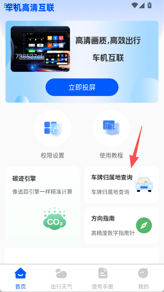 《手机车载互联》主打车机高清互联,可点击“立即投屏”进入车机投屏页面,连接车机后点“开始投屏”实现投屏。具备车牌归属地查询功能,按格式输入车牌,点击“查询”即可获取结果。还拥有方向指南,高精度数字指南针、碳迹引擎,以及权限设置、使用教程等辅助功能,满足出行多方面需求。