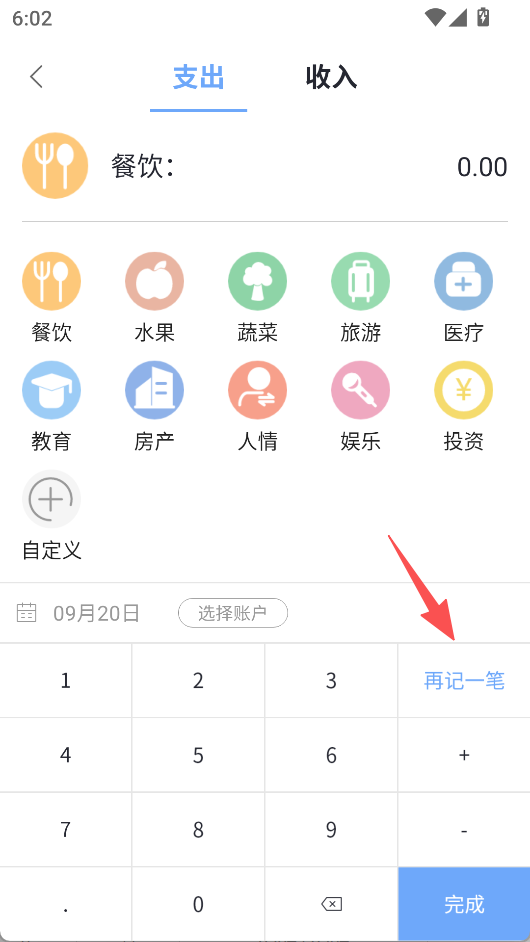 2、可选择餐饮、水果等支出分类,输入金额完成记账。