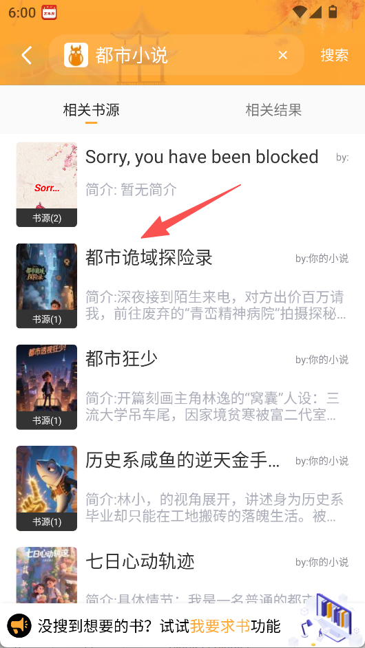 2、搜索与书源展示联动,输入关键词后呈现相关书源和小说列表,便于挑选不同来源的作品。