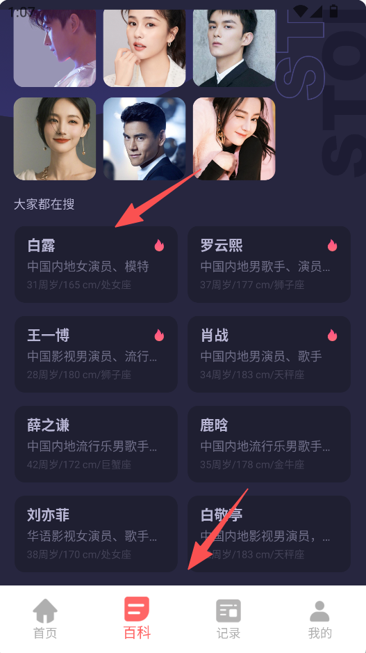 2、点击底部“百科”,能看到“大家都在搜”的明星推荐卡片。