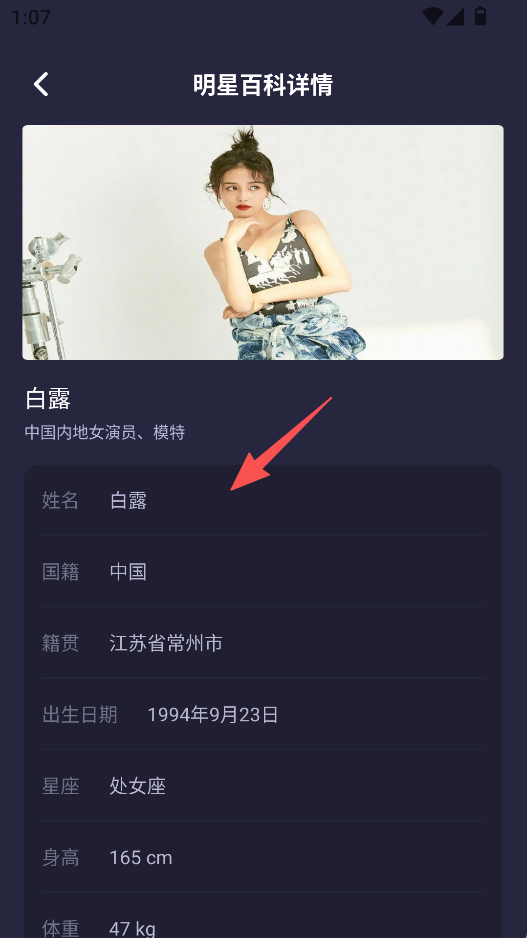 3、点击明星卡片进入“明星百科详情”页,可查看明星的姓名、国籍、籍贯等详细资料。