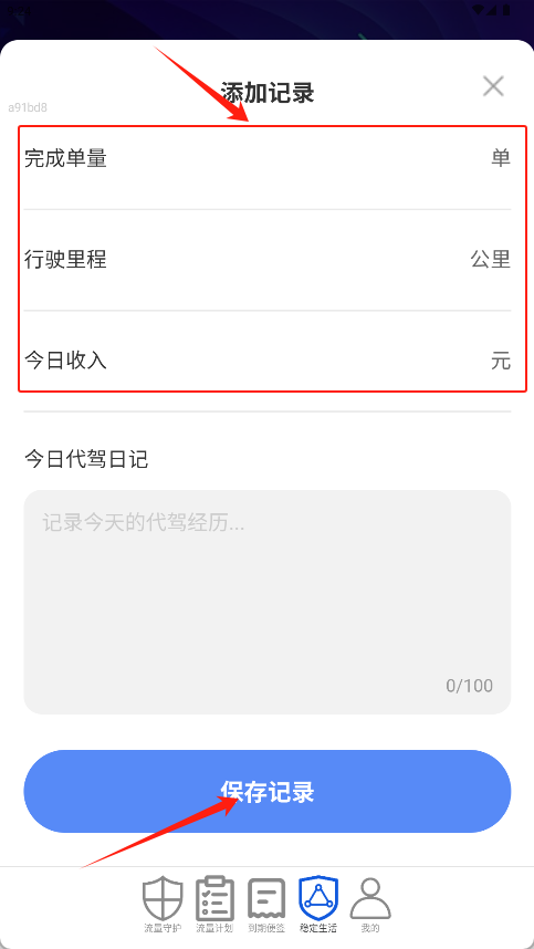 3、输入完成单量、行驶里程、今日收入等信息后点击“保存记录”。
