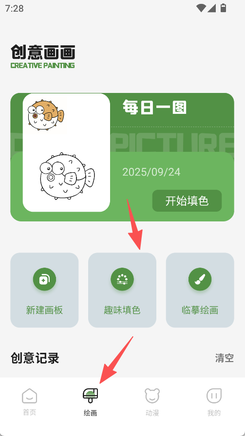 3、支持多种绘画形式,既有填色类的趣味创作,也有新建画板的自由绘制,还有临摹绘画的学习模式。