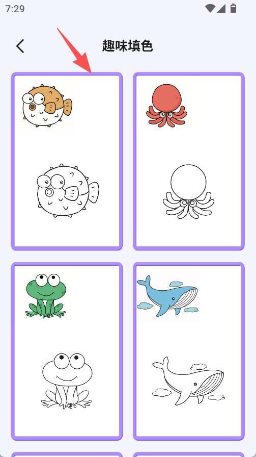 3、趣味填色包含河豚、章鱼、青蛙、鲸鱼等多样图案,种类丰富,能满足不同的绘画喜好。