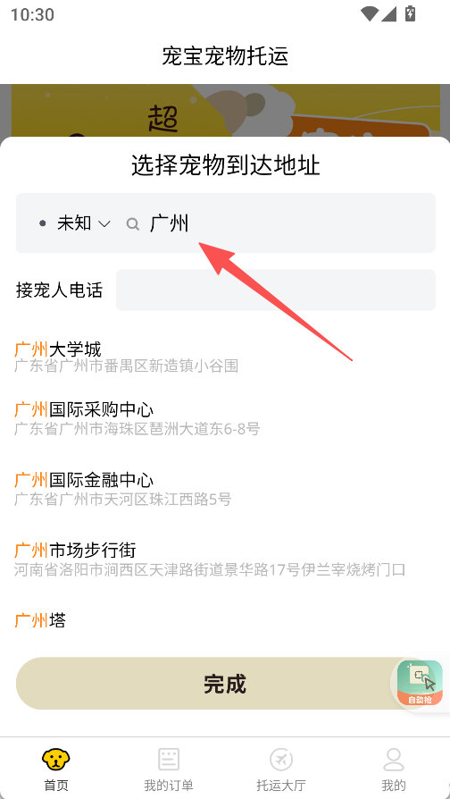 1、在页面,搜索并选定宠物到达地址,填写接宠人电话后点击“完成”。