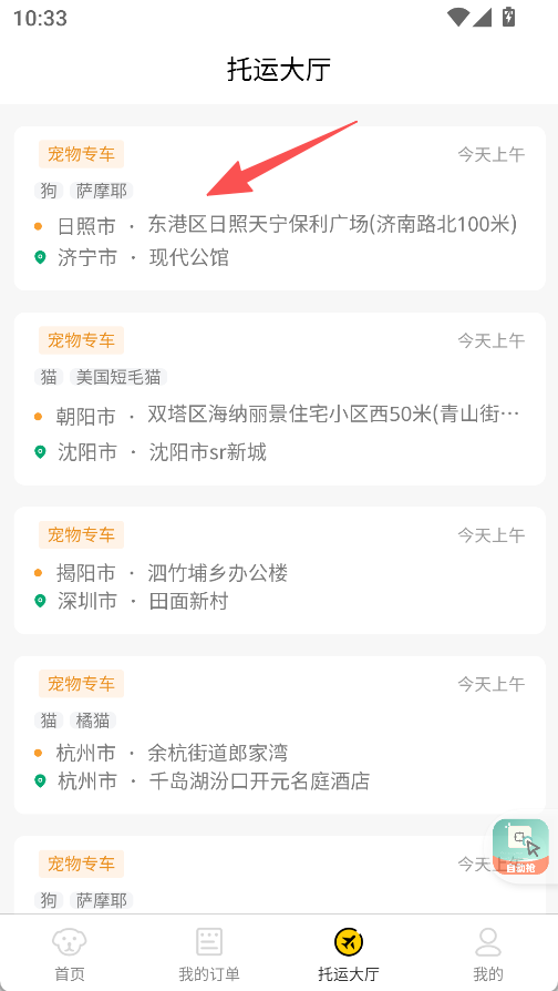 3、托运大厅的宠物专车信息清晰,出发地、目的地、宠物种类标注明确,便于快速挑选车次。