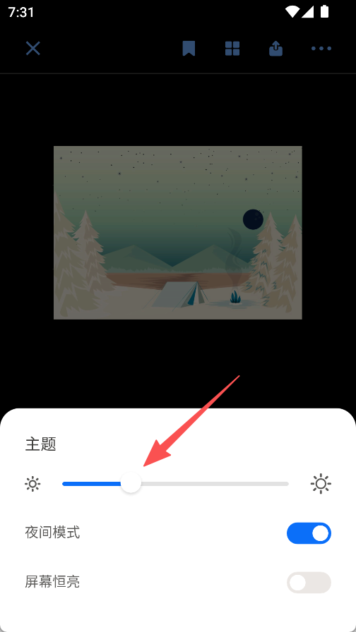 1、可进行图片查看,调节主题亮度,开启夜间模式或屏幕恒亮,优化不同场景下的视觉体验。