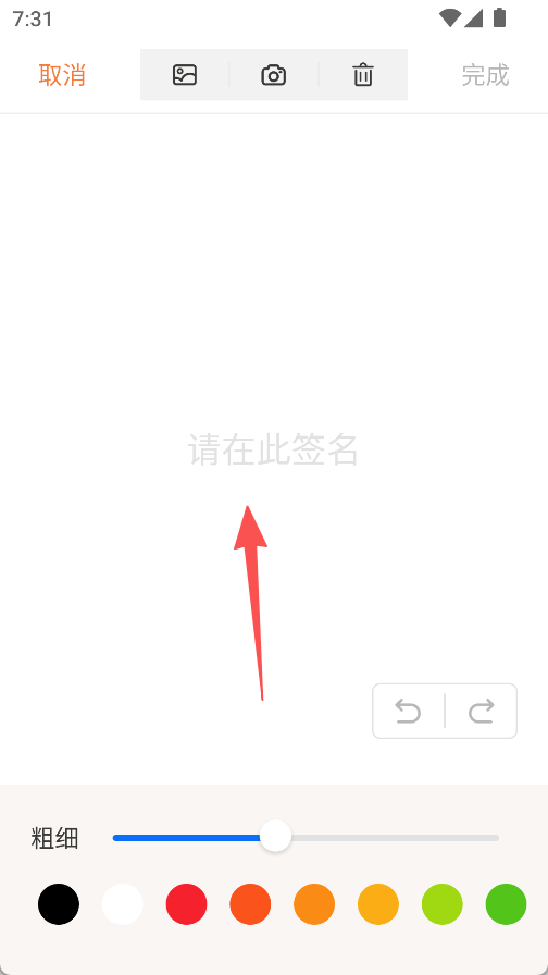2、进入签名界面,在指定区域签名,调整笔迹粗细、选择颜色。