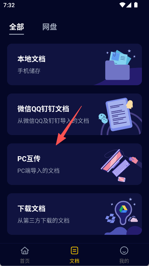 3、进入文档页面,查看本地、微信QQ钉钉导入的文档,以及PC互传、下载的文档。
