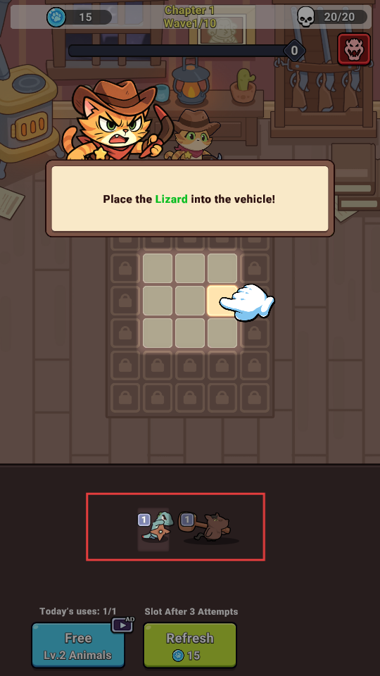 1、按照提示将下方【Lizard】类动物拖拽至上方格子,完成初始部署,为战斗准备。