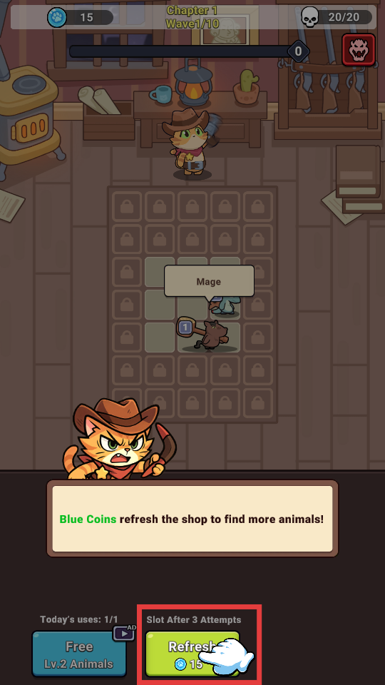 2、当动物种类不足时,花费【15】蓝币点击【Refresh】按钮,刷新商店获取更多动物。