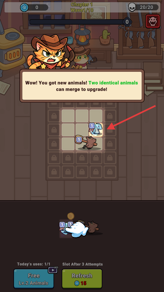 3、观察到相同等级动物(如【1】级类),将其合并升级,提升战力,遵循“Twoidenticalanimalsmerge”规则。