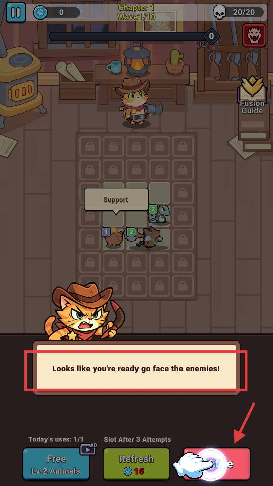2、道具援护动物避险:战斗时添加对应道具,能直接帮助动物战士化解当前面临的危险状况。