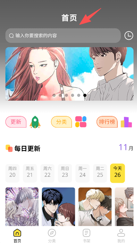 1、进入首页,浏览每日更新板块的漫画,查看对应日期的内容。