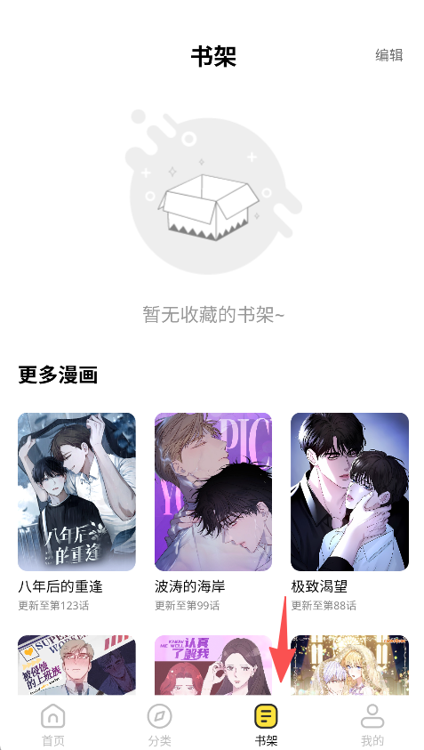 2、书架板块整合收藏功能与更多漫画推荐,既便于管理已收藏的漫画资源,兼顾收藏管理与内容拓展的双重需求。