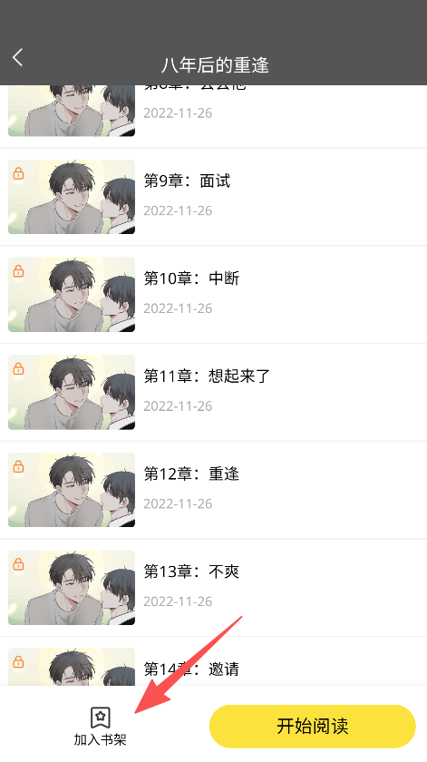 3、漫画章节页集中设置章节信息、加入书架按钮与开始阅读入口,操作入口集中且明确,简化从查看章节到启动阅读的操作步骤。