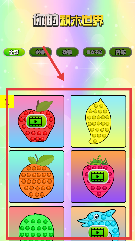 1、进入游戏,在分类标签(全部、水果、动物等)中,挑选想要的造型。
