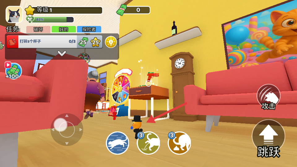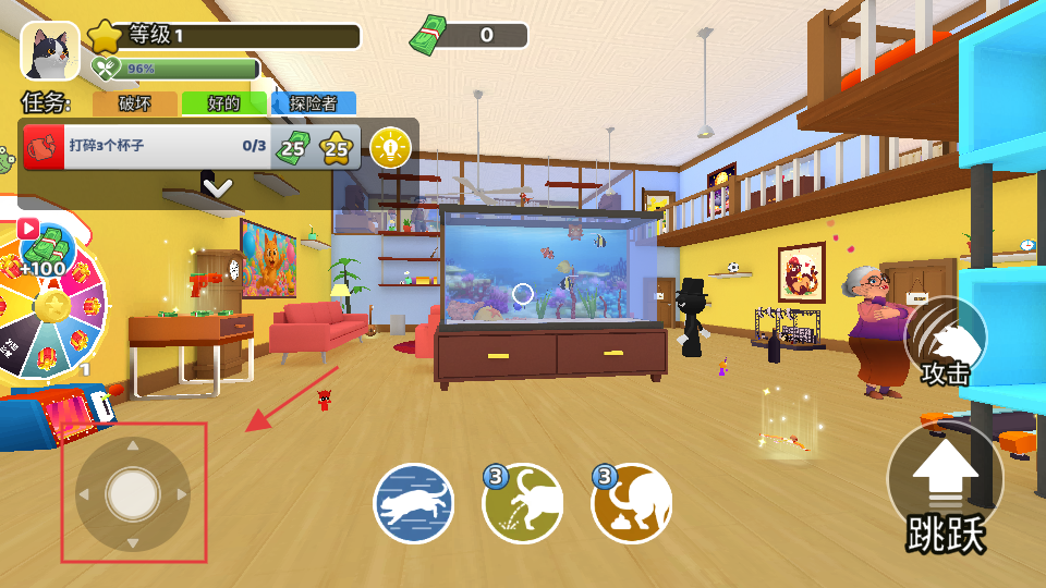 2、通过左侧方向操控盘控制猫咪移动,右侧有【攻击】【跳跃】等功能按钮。