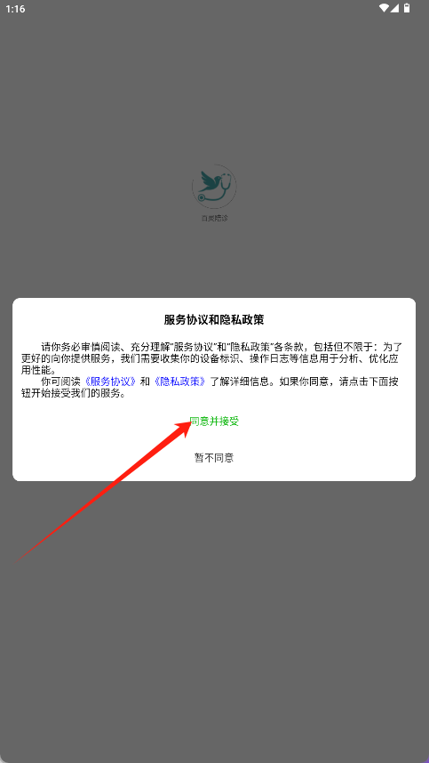 1、首次打开软件时,在服务协议弹窗中点击“同意并接受”按钮。