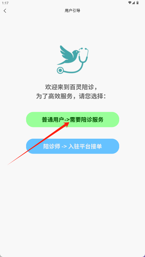 2、进入用户引导页后,根据身份选择“普通用户->需要陪诊服务”绿色按钮。