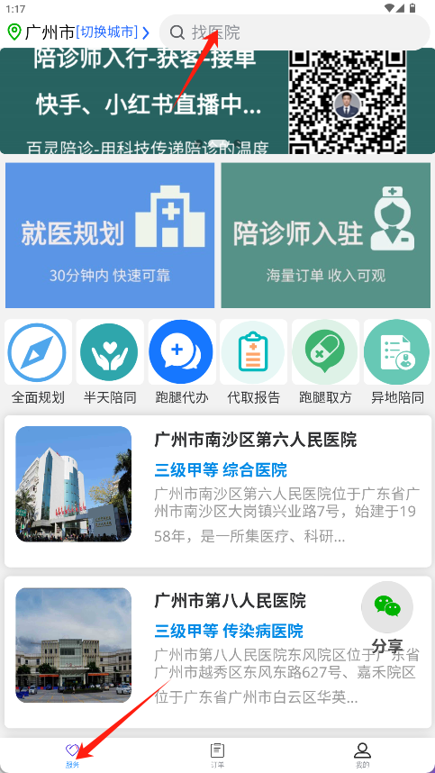 3、在首页底部导航栏点击“服务”图标,即可查看全部服务与医院信息。