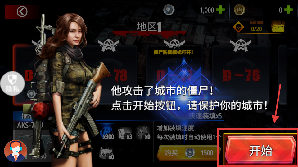 1、点击【开始】按钮开启战斗,投身守护城镇、消灭僵尸的任务,准备迎接挑战。