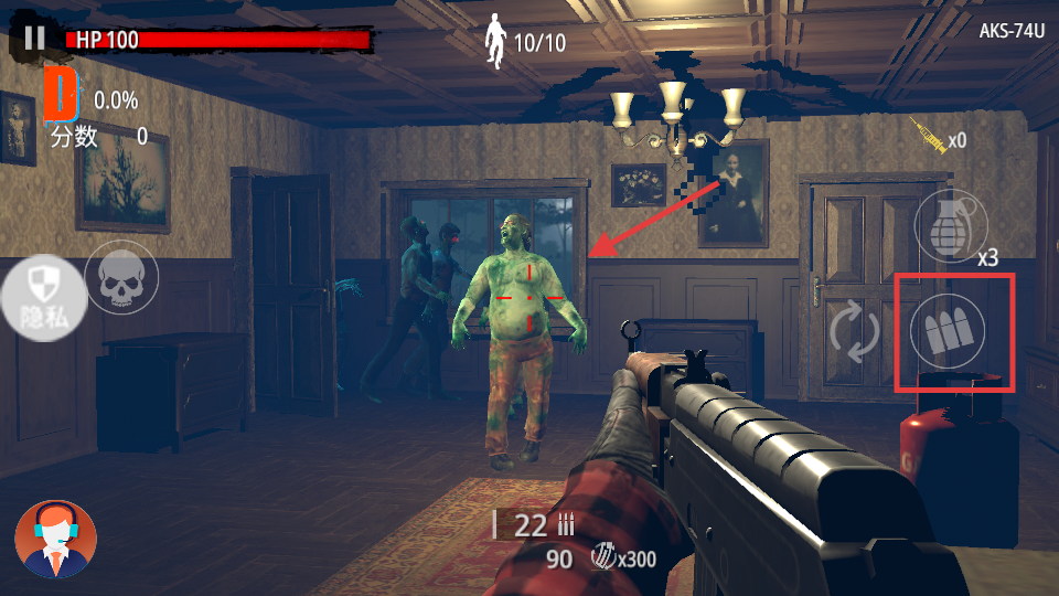 2、战斗时瞄准僵尸【AKS-74U】射击,留意弹药数,点击弹药图标补充火力,躲避攻击。